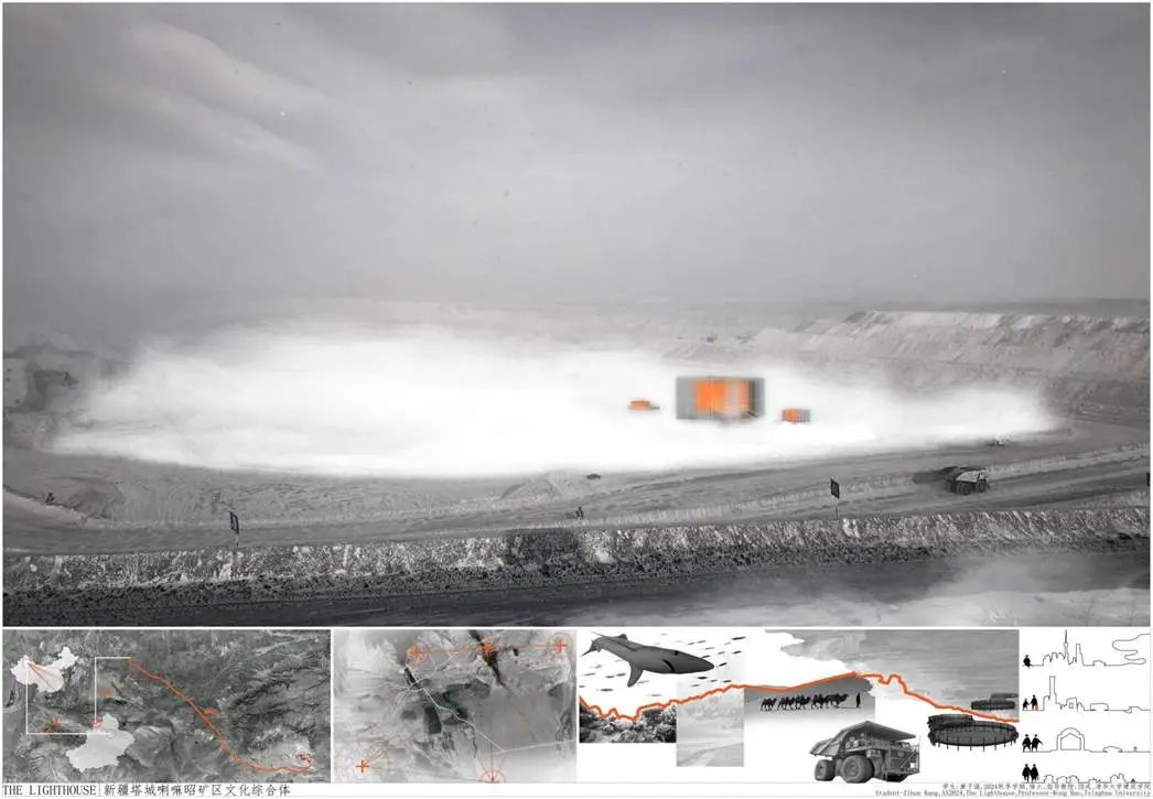 该综合体是一处煤田主题的文旅综合体,包括了生态修复展览馆、矿区主体乐园、营地服务中心等。建筑主体由地上特色展厅部分和地下接待、会议、营地服务等部分构成,并对矿区范围整体规划进行了基础构想。通过建筑手法应对场地的主要问题,如大风天气等,尊重并保留场地矿区历史遗迹,赋予了夜旅游、沉浸空间等新的功能。希望能够通过建筑方案设计充分发掘场地原有价值,利用矿区特色资源带动周边经济,唤醒人们的反哺意识。
