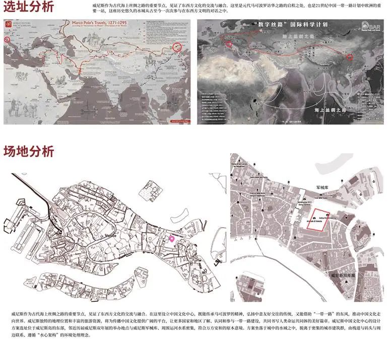 该设计题为《万方共安和》,选择万方安和一景进行转译,选址于见证东西方古今交流的水城威尼斯,构想为一座兼具多种功能的中国文化中心。设计流程为首先对图咏诗文进行文本分析,从中提取重点意象并分出“佛家”、“道家”、“儒家”三重层级,整合出建筑模型与prompt词条网,再从白模中选取透视角度,根据场景修改提示词与权重等参数,加入controlnet,通过文字与图像的双重约束控制AI。在得到基础图片后,通过局部重绘与PS进行手动调整、添加场景素材。在最终效果图上,方案坐落于环绕的水域之中,体现了儒释道三种文化兼容并蓄、多维地展现出中式美学的新活力。